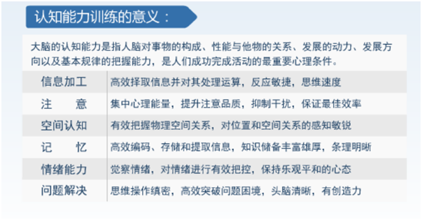 据悉该系统主要对人的大脑的认知能力 (反应力、注意力、记忆力、空间感知力、情绪管理力、思维力等) 进行科学地测评分析,并根据情况智能创建训练课程,训练更科学、系统化。针对认知力薄弱环节训练,可大幅提升认知能力。