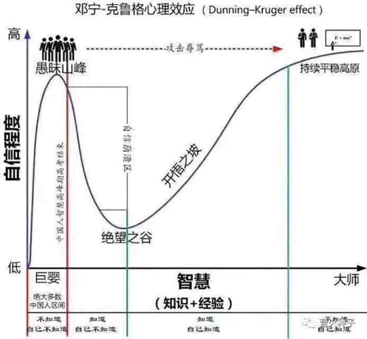 针对这一现象,美国心理学家Kruger和Dunning进行了一次实验研究。在实验中,Kruger让84位康奈尔大学的本科生回答了20道语法题,然后让他们对自己的语法能力做一个简单的自我评估。结果出人意料,真实成绩最差的10%学生普遍认为自己的语法水平,可以排进前1/3。紧接着,Dunning对人们阅读、下棋、驾驶等各种技能又进行了三次实验。最终,这三次的结果同第一次的结果,毫无二致。似乎越无能的人,越会认为自己无所不能。达尔文有一句话则说的更加形象:“无知比知识更容易让人自信。”
