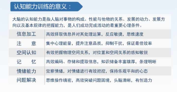据悉该系统主要对人的大脑的认知能力 (反应力、注意力、记忆力、空间感知力、情绪管理力、思维力等) 进行科学地测评分析,并根据情况智能创建训练课程,训练更科学、系统化。针对认知力薄弱环节训练,可大幅提升认知能力。