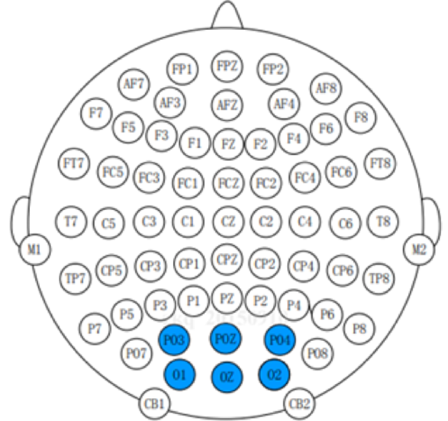 在使用视觉刺激装置来获取SSVEP信号时,在大脑皮层中与枕叶视觉区有关的脑电通道主要有六个,如下图: