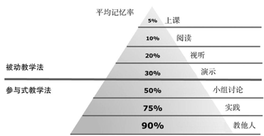 很多研究都在探讨不同学习方式的具体成效,即最后你究竟能记住多少所学内容。位于缅因州的国家训练实验室总结出了下图所示的金字塔型数据。