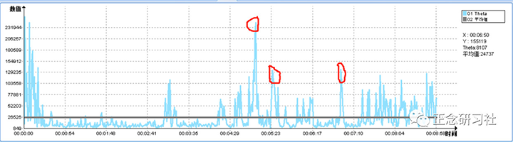 在视友科技佰意通集训版记录到这位学生的alpha,beta,theta,delta,gama五种波形中,我们发现该生的theta波有明显的且相对宽幅的三次次脉冲,如下图所示。这个脑波图恰好和该生描述的有两次创意的想法相符。而科学研究也指出theta波与我们的直觉、创造力密切相关。
