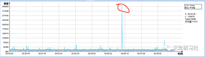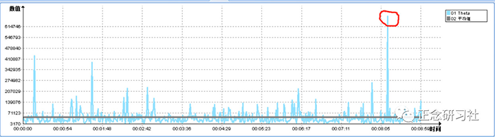 在佰意通集训版记录到这位学生的alpha,beta,theta,delta,gama五种波形中,我们发现该生的theta波有一次最为显著的脉冲,如下图所示。这个脑波图恰好和该生描述的有一次创意的想法相符。